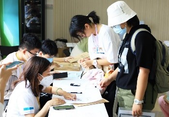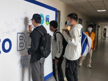 由于学院提前做好了迎新的各项准备工作,新生们在四教进行了入楼扫码后,在指示牌和志愿者的引导下,有条不紊进行了身份比对、档案材料上交等报到环节,学院也为新生发放了院服和帽子。报到手续顺利完成后,同学们纷纷在学院准备的签名墙上签下了自己的名字,一笔一划,既是对未来的期待,也是不断前进的勉励,相信同学们一定能在这四年中学有所得,砥砺前行!