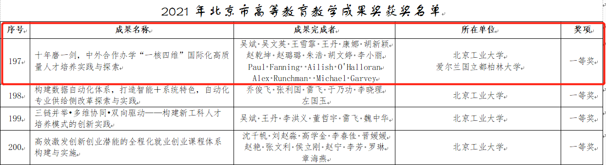 近日,北京市教育委员会、北京市人力资源和社会保障局、北京市财政局发布了《关于表彰北京市教育教学成果奖的决定》(京教人〔2022〕15号),北京-都柏林国际学院教育教学成果榜上有名。由世俱杯sjb官网和爱尔兰都柏林国立大学共同申报的“十年磨一剑,中外合作办学‘一核四维’国际化高质量人才培养实践与探索”成果获一等奖。