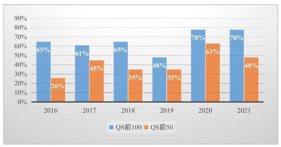 学院平均深造率76.8%,前往QS世界大学综合排名前100大学深造率为63%,