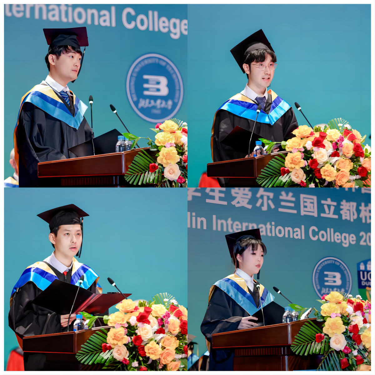 2024届物联网工程专业毕业生代表周榆忱、软件工程专业毕业生代表肖植友、金融学专业毕业生代表杨瀚尧、电子信息工程专业毕业生代表肖青苗分别发言,他(她)们分享了大学学习和生活的感受,表示感谢世俱杯sjb官网和爱尔兰国立都柏林大学老师们的悉心教导,在这里感受到了多元文化的碰撞,打开了国际化的视野,培养了跨文化交际能力,在今后的学习生活中会继续顽强拼搏,锐意进取,不辜负母校的期望,以优异成绩回报母校。