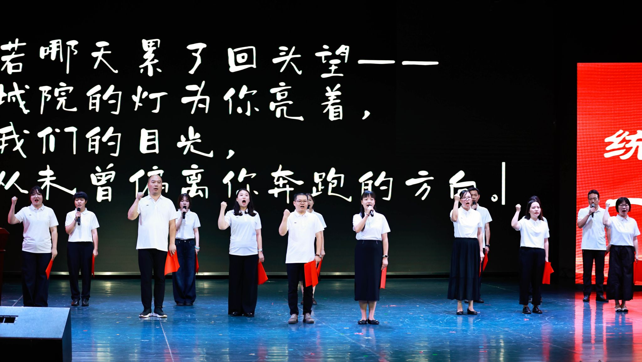 暖场视频《献给每一个即将告别的夏天》用光影勾勒了学子们的成长轨迹,既串联起大学四年的珍贵记忆,更表达出他们对未来人生的憧憬与向往。毕业班辅导员代表为全体毕业生带来的诗朗诵《毕业,新的启航》,他们用最深情的语言,为毕业生送别。