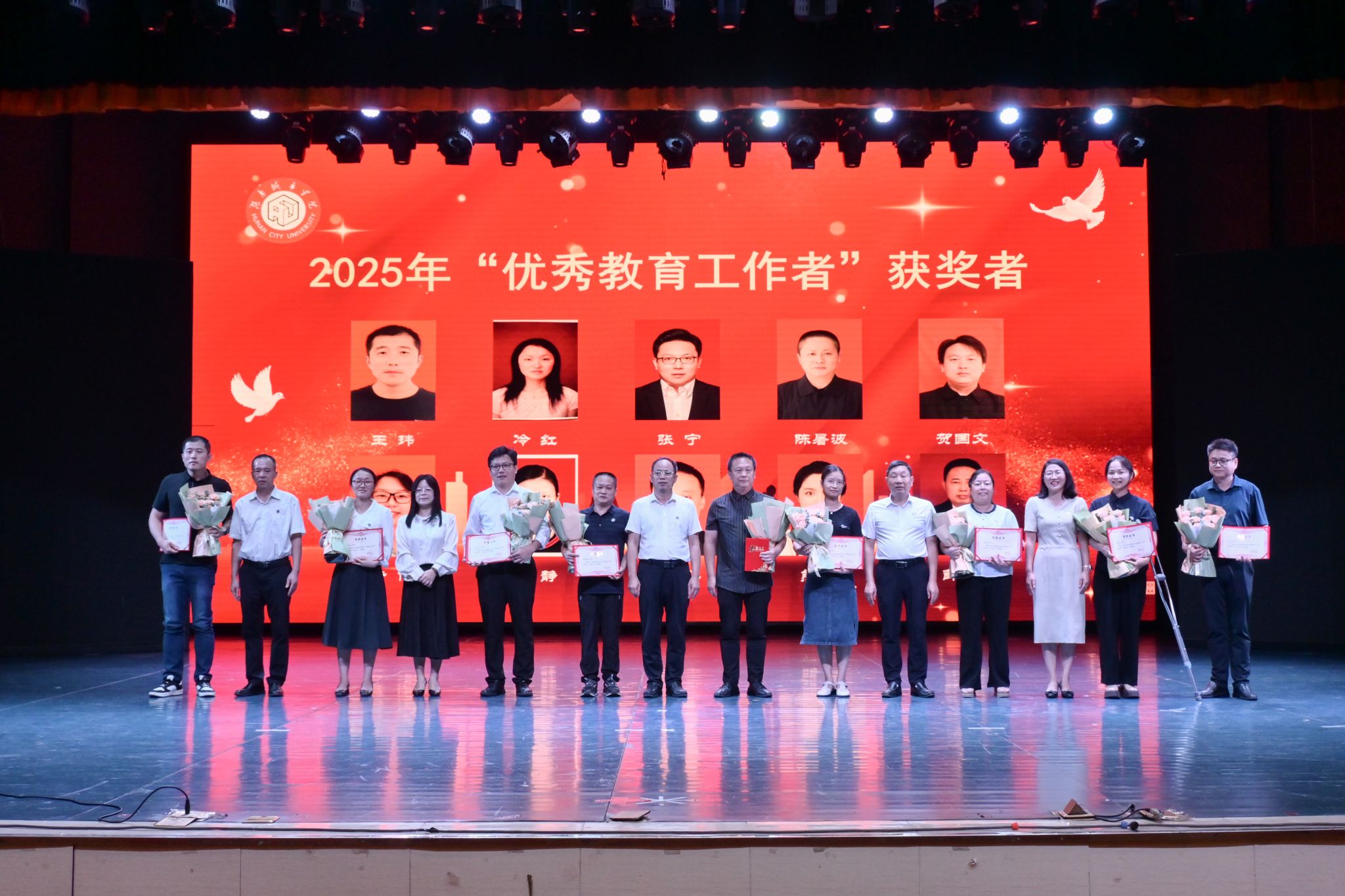 副校长谭献良先后宣读了《关于表彰2024年度单位目标管理考核先进集体及单项奖的决定》《关于表彰2025年师德先进个人的决定》《关于表彰jdb电子游戏官方网站第41个教师节先进人物(团队)的决定》。组织部等10个部门获评2024年度单位目标管理考核先进集体,纪委/监察专员办公室等10个部门获2024年度单位目标管理考核单项奖。张莉等15位教师获师德先进个人,习胜丰等10位教师获“光荣从教三十年”奉献奖,王林飞等10位教师获最美教师,王平等20位教师获优秀教师,王玮等10位教师获优秀教育工作者,理学院数学建模与数学竞赛教育“灯塔团队”获优秀教育工作团队。