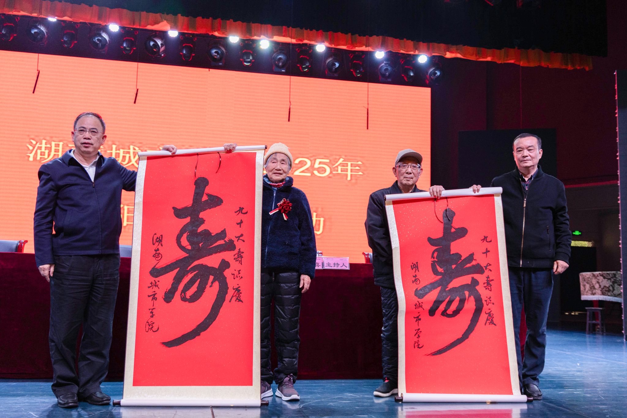 活动现场气氛喜庆祥和。与会领导给80、90岁寿星赠送“寿”字幅,给钻石婚、金婚老同志赠送纪念照,表达良好祝愿。