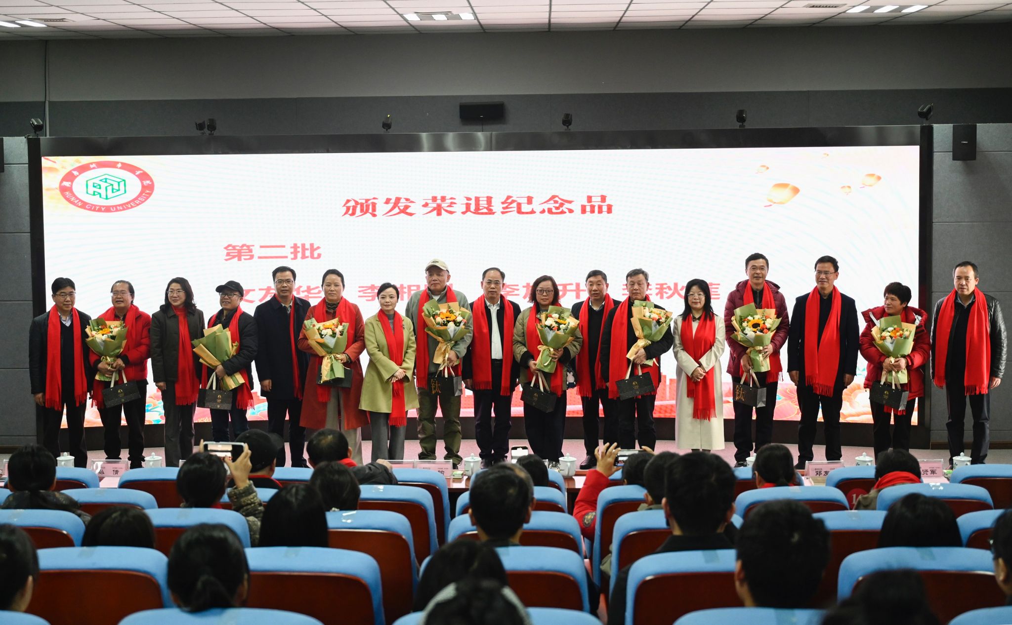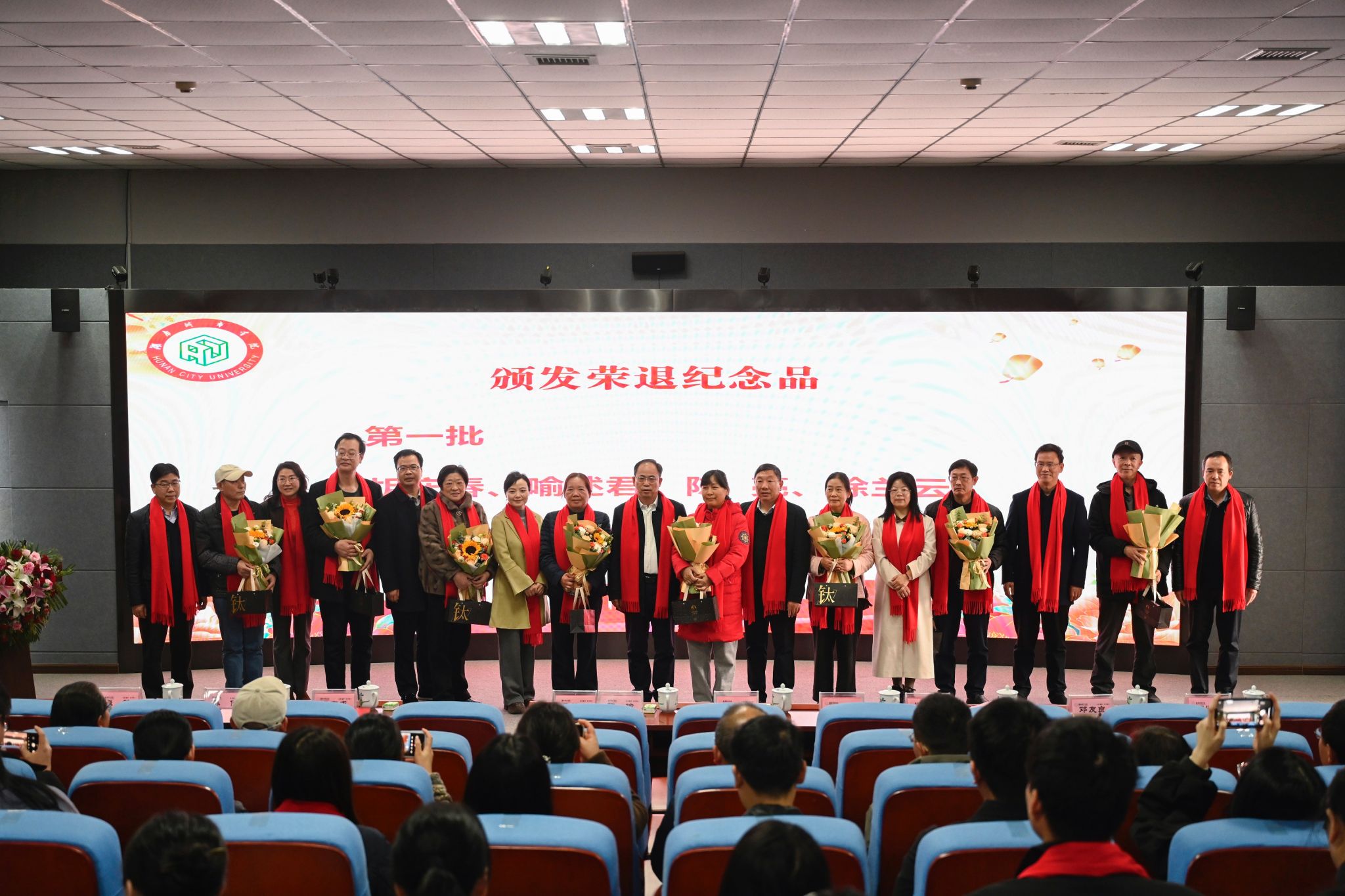 会上,副校长谭献良宣读了2025年度光荣退休的教师名单。随后,16位荣退教师代表依次上台,校领导为他们颁发了荣退纪念杯,这一纪念杯承载着全校师生的诚挚谢意与美好祝愿,同时,新进教师代表向荣退教师们敬献了鲜花。全场以热烈的掌声,向为学校发展倾注青春、奉献智慧的荣退教师们致以最崇高的敬意。