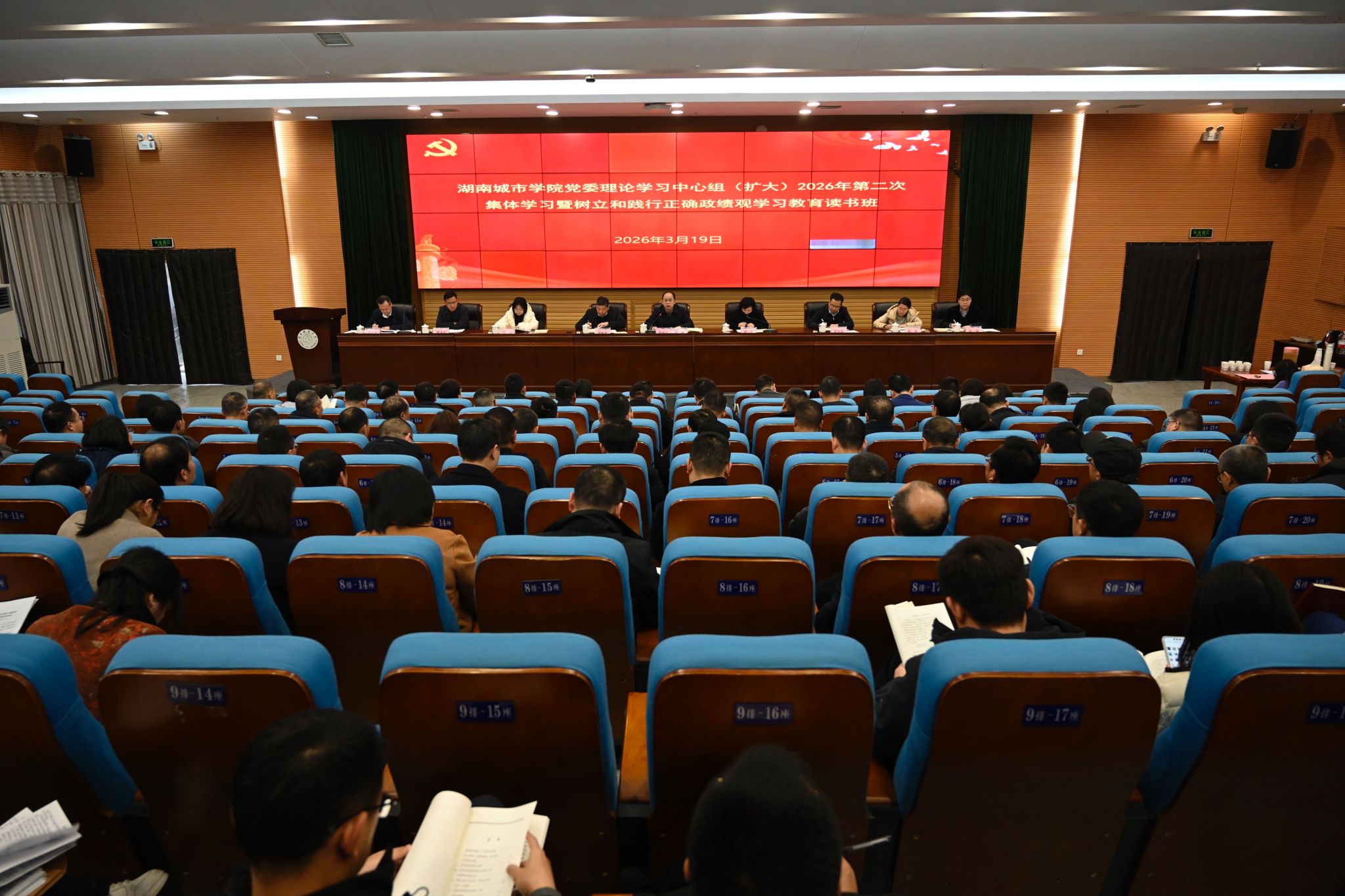 本网讯(通讯员 蔡润晨)3月19日,学校党委理论学习中心组(扩大)2026年第二次集体学习暨树立和践行正确政绩观学习教育读书班在图书馆报告厅举行,党委书记何振主持会议并讲话,全体校领导、副处级以上干部参加学习。