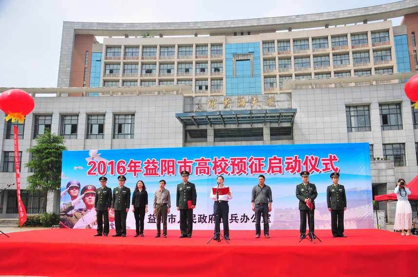 (本网讯)“保卫国家终不悔,绿色军营献青春”,“莘莘学子投笔从戎,参军报国建功立业”。4月27日下午,图书馆前坪广场悬挂满着各式与参军有关的横幅标语。为了让在校大学生了解部队、了解大学生入伍优惠政策,2016年益阳市高校预征启动仪式在jdb电子隆重举行。