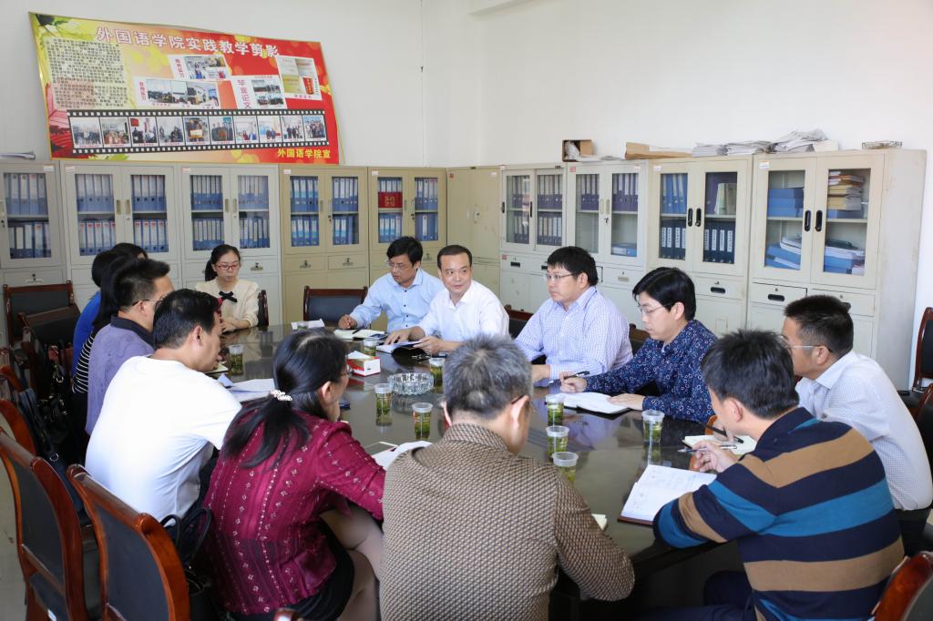 (本网讯)10月9日下午,党委书记罗成翼、副校长雷存喜率教务处、应用与创新管理中心相关负责人到外国语学院调研。外国语学院领导班子成员、各教研室主任参加调研座谈会。