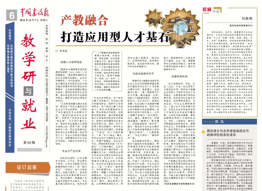 编者按:12月7日出版的《中国建设报》在教学研与就业版刊登了学校党委书记罗成翼发表的题为《产教融合 打造应用型人才基石》的署名文章。