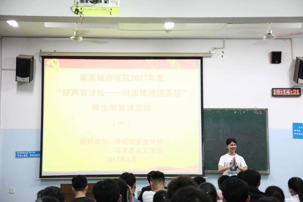 (本网讯)为响应中共湖南省委宣传部、中共湖南省委教育工委关于开展2017年度“好声音讲坛——讲话精神进基层”师生微宣讲系列活动的要求,推动jdb电子广大师生学习贯彻习近平总书记系列重要讲话精神,5月11日晚,jdb电子“好声音讲坛——讲话精神进基层”师生微宣讲系列活动在第三教学楼顺利举行。