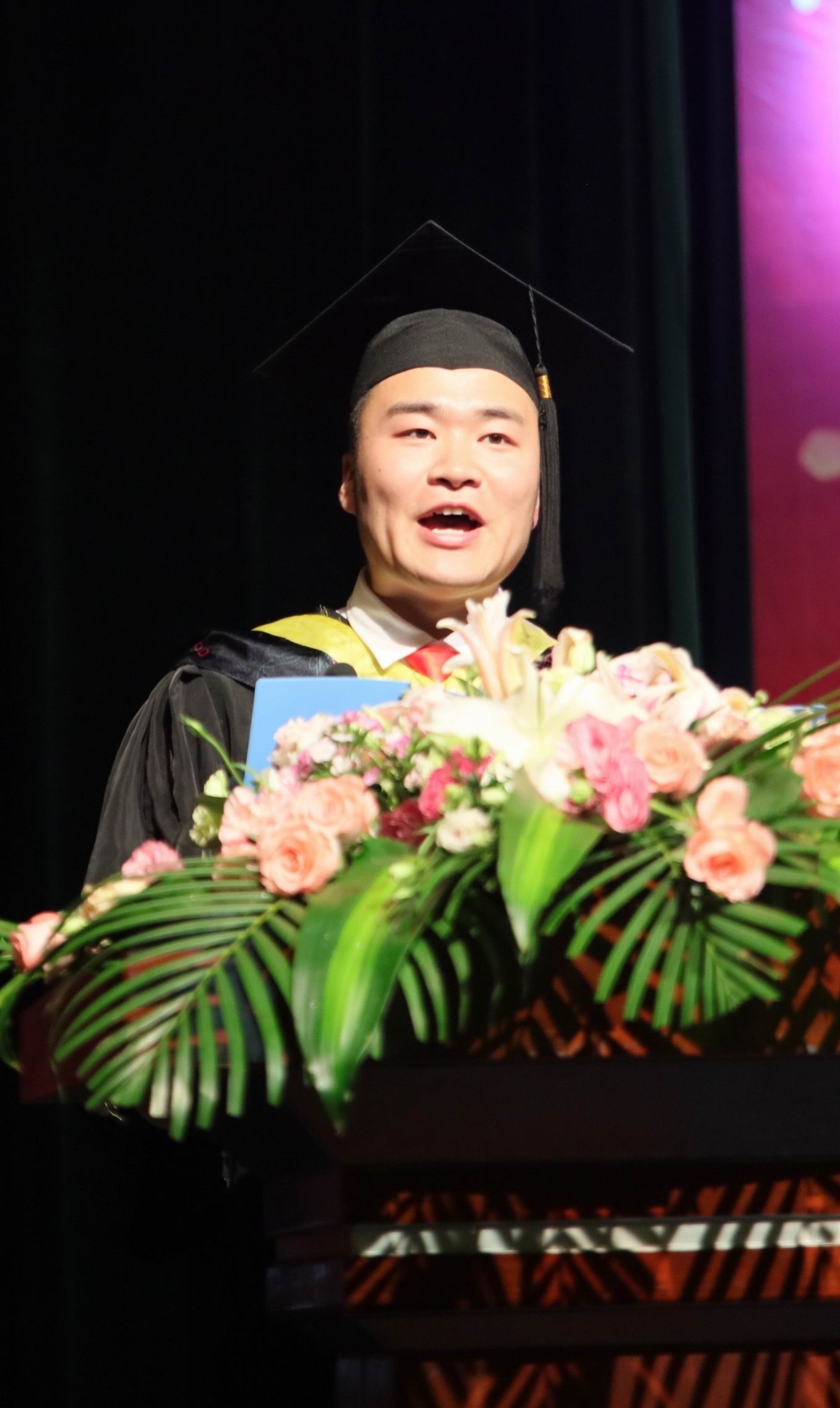 毕业生代表土木工程学院朱鑫瑞发言,感谢母校恩师们的谆谆教诲和亲切关怀,表示要做品学兼优并胸怀大志的人,做富有责任并敢挑重担的人,做与时俱进并开拓未来的人。