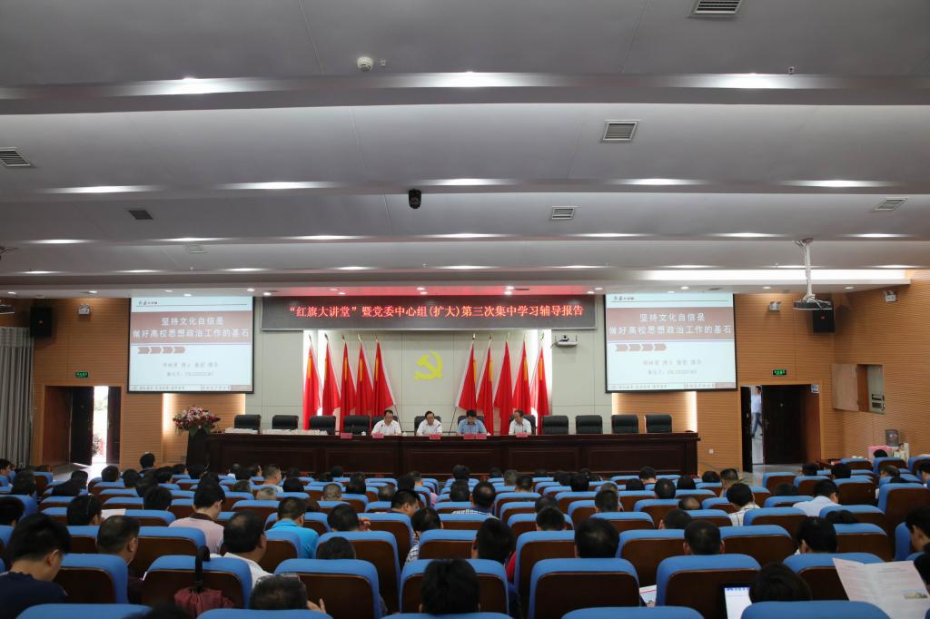 (本网讯)6月29日下午2:30,“红旗大讲堂”暨学校党委中心组(扩大)第三次集中学习辅导报告会在图书馆报告厅举行,特邀国家国防科技工业局专家委员会委员邹树梁教授作了题为“坚持文化自信是做好高校思想政治工作的基石”的报告。《求是》杂志社办公室原副主任张福俭、红旗出版社办公室主任鲁大伟,学校党委中心组成员、副科以上干部、全体辅导员、马克思主义学院全体教师参加会议。报告会由党委书记罗成翼主持。