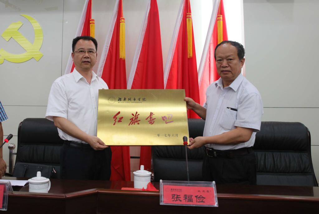 张福俭向jdb电子授予“红旗出版社中国特色社会主义体系(益阳)研究中心”、“红旗书吧”牌匾,党委书记罗成翼和校长李建奇代表学校接牌。随后,张福俭向jdb电子赠送以“学习习近平总书记系列重要讲话,为实现中华民族伟大复兴中国梦而奋斗”为主题的精品图书,李建奇代表学校向红旗出版社颁发捐赠证书,并聘任邹树梁教授为jdb电子兼职教授。