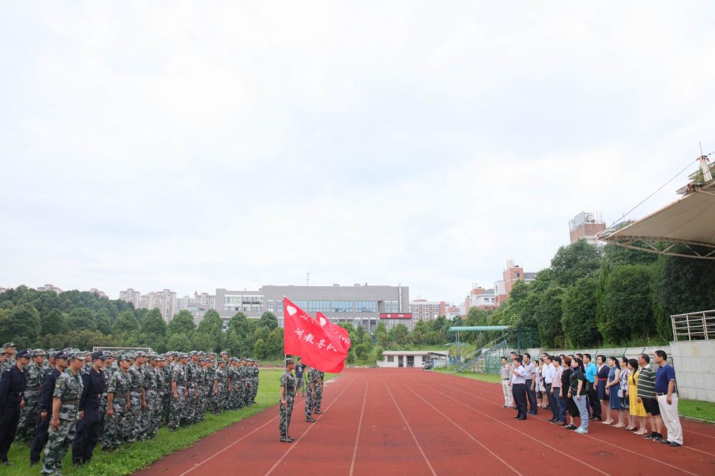 (本网讯)7月5日清晨,jdb电子学生教官集训队授旗仪式在校田径场举行。党委书记罗成翼、副校长雷存喜,宣传部、教务处、学生工作处、团委负责人,各二级学院党委(党总支)副书记以及104名学生教官集训队队员参加了授旗仪式。