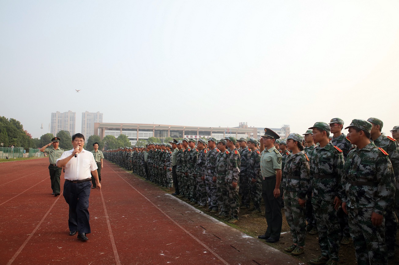 党委书记罗成翼在武装部部长龙文和军训总教官李波的陪同下,检阅了由2017级参训新生组成的方队。