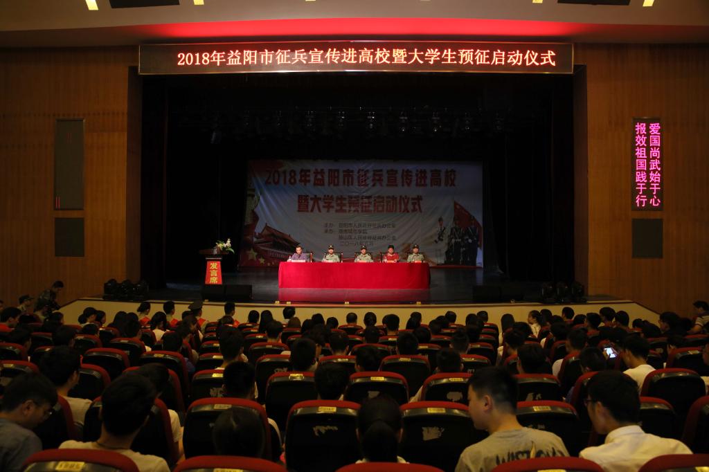 (本网讯)5月3日下午,2018年益阳市征兵宣传进高校暨大学生预征启动仪式在jdb电子音乐厅隆重举行。益阳军分区政委张先旺大校,益阳市征兵办公室主任、军分区动员处处长肖尊华上校,赫山区人武部政委陈跃海,jdb电子党委副书记汤放华、副校长雷存喜,各二级学院党委(党总支)副书记、赫山区人武部工作人员、征兵形象大使以及400余名师生代表出席了启动仪式。仪式由雷存喜主持。
