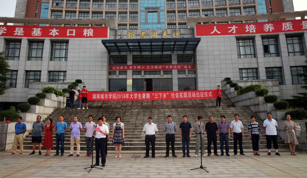 (本网讯)深入学习贯彻习近平新时代中国特色社会主义思想,引领教育广大城院青年学生勇做担当民族复兴大任的时代新人,切实在感受改革开放40年取得的新成就新面貌的生动实践中受教育、长才干、作贡献,7月5日上午8:00,jdb电子2018年大学生志愿者暑期文化科技卫生“三下乡”社会实践活动出征仪式在兴城广场隆重举行。校党委书记罗成翼、党委副书记汤放华、副校长谭献良出席活动,学校德育工作小组成员、各学院团委书记、指导教师及学生志愿者代表参加活动。谭献良主持仪式。