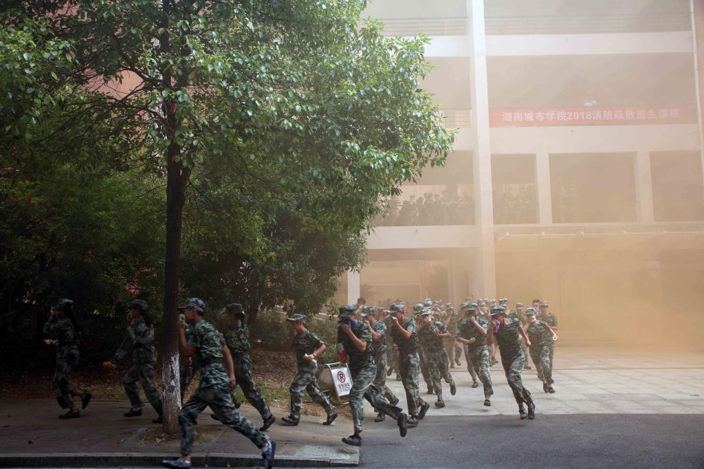 中午12:20,火灾应急疏散逃生演练正式开始。随着一声哨响,工作人员在第二教学楼内点燃了烟雾弹。不一会儿,滚滚浓烟充斥着楼道,随后刺耳的消防警报声响起。5000余名新生用随身携带的湿毛巾捂住口鼻,在义务消防员的指引下低姿势快速撤离“起火”建筑物,迅速撤离至应急避难场所。与此同时,搜救队分层对被困人员进行了搜救,益阳市公安消防特警大队消防救援车辆也赶到现场,利用水枪开展灭火作业,并依靠登高消防车对高处被困人员进行营救。