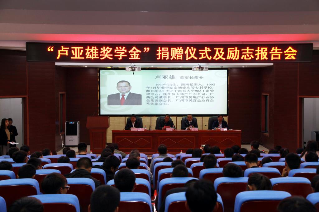 (本网讯)2018年10月19日上午,“卢亚雄”奖学金捐赠仪式及励志报告会在建规楼121报告厅举行。jdb电子89级校友卢亚雄,校长李建奇、党委副书记汤放华、副校长谭献良以及学生工作处、团委、各二级学院校友工作分管领导、学生代表、获奖学生参加了会议。捐赠仪式由汤放华主持。