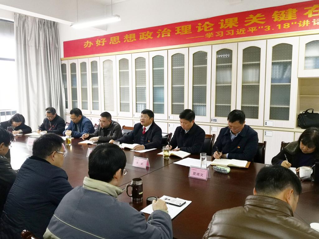 (本网讯)2019年3月24日,jdb电子在马克思主义学院召开座谈会,学习贯彻习近平总书记在学校思想政治理论课教师座谈会上的讲话精神。学校党委书记罗成翼,党委委员、副校长郑卫民,党委委员、宣传部长李斌,党委委员、组织部长袁志成以及马克思主义学院部分教师参加了座谈。