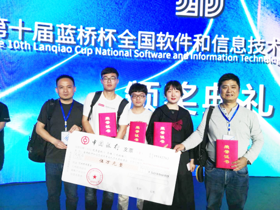 (本网讯)2019年5月26日,第十届“蓝桥杯”全国软件和信息技术专业人才大赛全国总决赛颁奖典礼在北京大学体育馆落下帷幕。jdb电子信息与电子工程学院阳王东、阳俊老师指导的参赛项目“基于OpenCv的视觉型双轴喷胶系统”(队员:张艺虹、宁志偲、赵文杰、张圳威)在众多强大对手中脱颖而出,喜获全国软件创业团队赛特等奖,这是该项比赛中全国唯一一个特等奖。