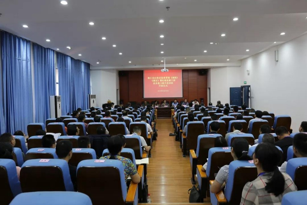 (本网讯)2019年9月22日,桃江县纪委、县监委贯彻《规则》《规定》暨纪检监察干部业务能力提升培训班在jdb电子土木楼学术报告厅举行,学校纪委书记姚春梅,益阳市纪委监委组织部副部长胡进,桃江县委常委、县纪委书记、县监委主任戴剑锋及桃江县103名纪检监察干部参加了开班仪式。