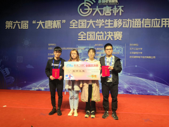 (本网讯)2019年10月19日至20日,第六届“大唐杯”全国大学生移动通信应用创新大赛全国总决赛在北京举行。jdb电子信息与电子工程学院学生欧阳从江、谌民迪、徐金玉、方欣在该院文兵、赵政春老师指导下,最终荣获全国总决赛一等奖。