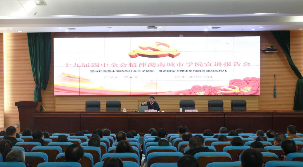 (本网讯)为深入学习宣讲《中共中央关于坚持和完善中国特色社会主义制度,推进国家治理体系和治理能力现代化若干重大问题的决定》(以下简称《决定》),深刻领会贯彻党的十九届四中全会精神,确保党和国家的重大决策部署按制度要求落到实处、见到实效,按照省委、省委教育工委部署要求,jdb电子游戏官方网站于12月4日上午在学校图书馆报告厅举行党的十九届四中全会精神宣讲报告会。党委书记罗成翼作宣讲报告。学校在家校领导,各二级党组织书记、副书记,机关党员,全体辅导员参加报告会。党委副书记、校长李建奇主持报告会。