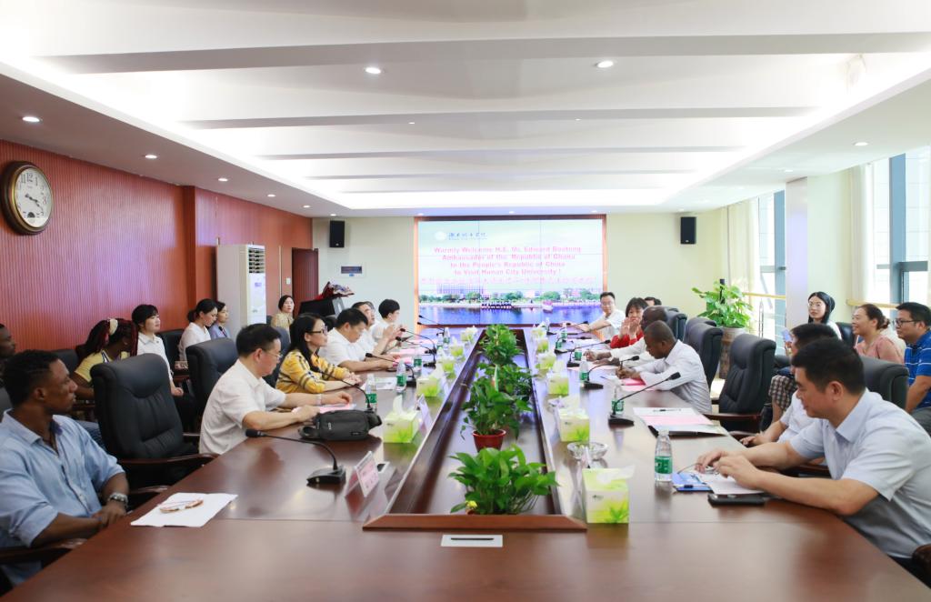 本网讯(通讯员 丁珊)2020年8月19日下午,加纳驻华大使爱德华•博阿滕来校考察调研,加纳驻华大使馆社交秘书杨光、湖南省商务厅西亚非洲处处长郭宁、湖南海外经贸发展集团有限公司总经理王彪、益阳市副市长刘国龙、市商务局局长李国大、副局长封雷、建设银行益阳分行行长刘志勇等陪同调研。