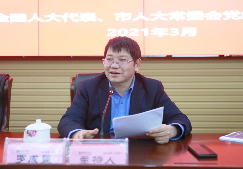 徐云波结合自己参加“两会”的见闻和感悟,从大会概况和特点、习近平总书记两会期间的重要讲话精神、党和国家领导人来团审议时的讲话精神、大会各项报告和规划纲要的主要精神以及湖南代表团及其本人履职情况等几个方面,提纲挈领、深入浅出地阐释了全国“两会”精神。他建议学校立足新发展阶段,贯彻新发展理念,构建新发展格局,将学校发展与国家命运紧密相连。抢抓乡村振兴战略全面实施机遇,积极参与县域城镇和村庄规划建设,在乡村建设中体现担当。抢抓数字经济发展历史性机遇,做优做强湖南新型智慧城市研究院等平台,在数字化发展、数字中国建设中彰显作为。抢抓“一带一路”倡议实施机遇,加强优势学科建设和人才培养,加快实现高质量发展。