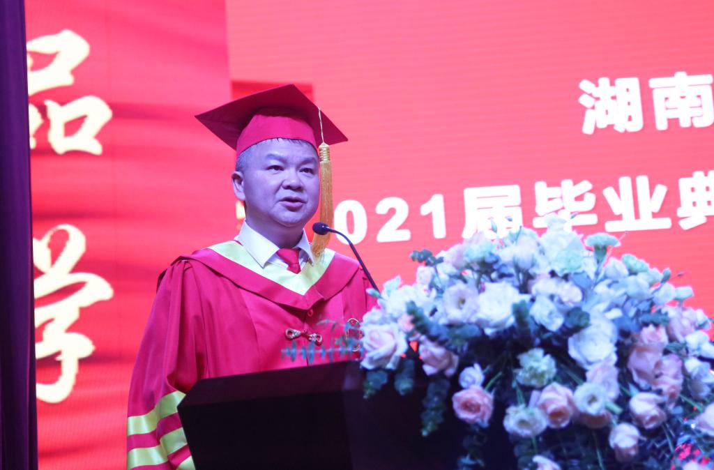 毕业典礼在庄严的国歌声中拉开帷幕。校长汤放华以《生逢盛世 肩负重任》为主题发表了热情洋溢的讲话。他代表学校向圆满完成学业即将奔赴新的工作岗位或继续求学深造的4400余名同学表示衷心的祝贺!向辛勤抚育同学们成长的父母和悉心教育同学们成才的老师致以最崇高的敬意!他指出,一代青年有一代青年的历史际遇,一代青年有一代青年的使命担当。站在“两个一百年”奋斗目标的历史交汇点上,身处科技革命和产业革命持续交融的新时代,面临机遇和挑战交织并存的新世界,同学们要秉承“品学兼修、知行统一”的校训精神,“心系人民、胸怀世界”,保持乘风破浪的昂扬姿态,承担起时代赋予的历史重任,方能不负这中华盛世。他希望毕业生们都能拥有“修齐治平、经国纬政”的才能,胸怀“经世济民、福泽万邦”的情怀,践行“天下兴亡、匹夫有责”的使命,把个人梦融入国家梦、民族梦之中,将回报家国、服务社会作为立德之源、立功之本,走好新时代赶考路,当好新时代答卷人。