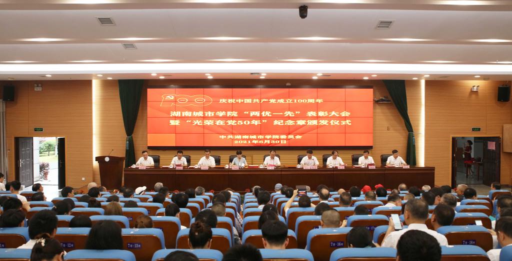 党委副书记何旭娟宣读了省、市和学校三级“两优一先”表彰决定。大会对6个获得全省高校党组织“对标争先”建设计划第二批项目单位及个人、12个获得益阳市委、市教育工委“两优一先”先进单位和个人、55个获得校级“两优一先”先进单位和个人进行了表彰。