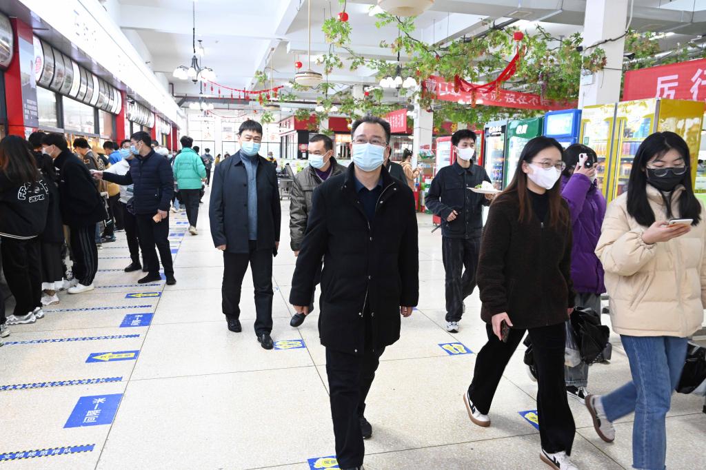 李建奇一行首先来到学校南门,看望慰问了寒风细雨中值勤的保安人员,询问了车辆、人员进出校园的管控情况,要求保卫部门务必要加强对人员的管控,不折不扣执行好人员进入校园须“核验身份、测体温、扫场所码、戴口罩”的规定动作,把好疫情防控第一道关口。随后,李建奇一行来到防控办了解了防疫物资储备情况,查看了工作台账,并向工作人员询问了jdb电子全员核酸检测的完成情况。他表示,防疫办要细化防疫举措,认真做好人员摸排、管控,严格落实核酸检测,为全校两万多师生筑牢安全防线。李建奇一行还来到第三食堂,对就餐环境、师生个人防护等进行了检查。