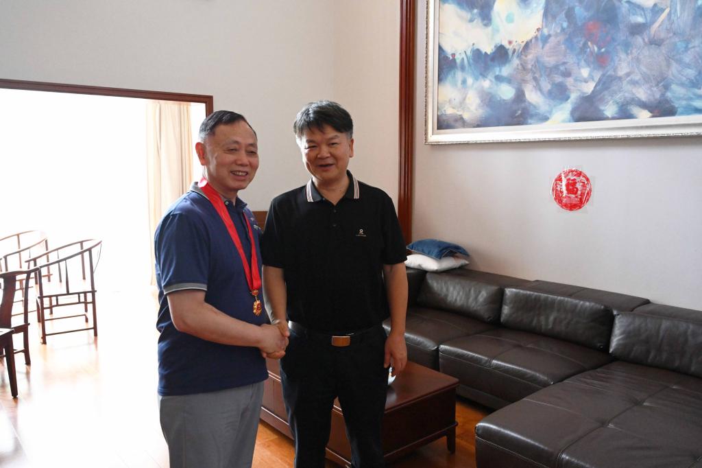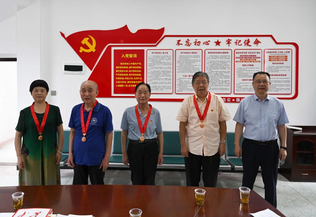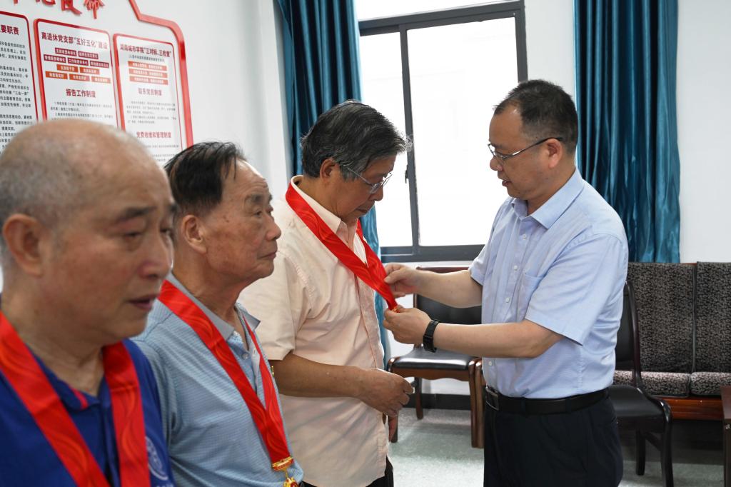 校长汤放华为原学校党委书记李新国颁发“光荣在党50年”纪念章。