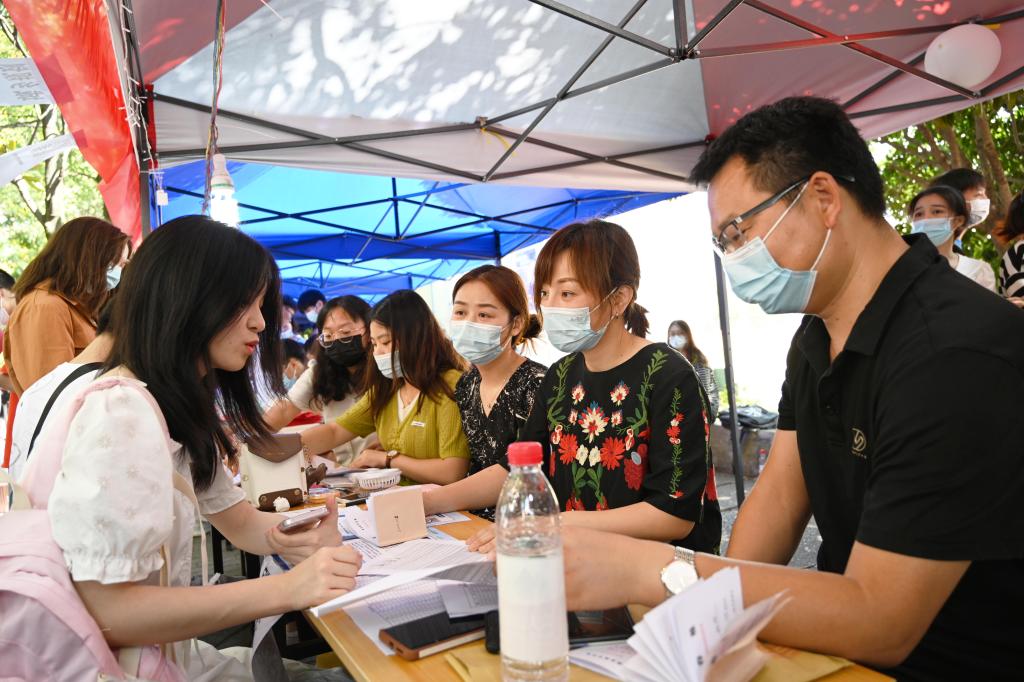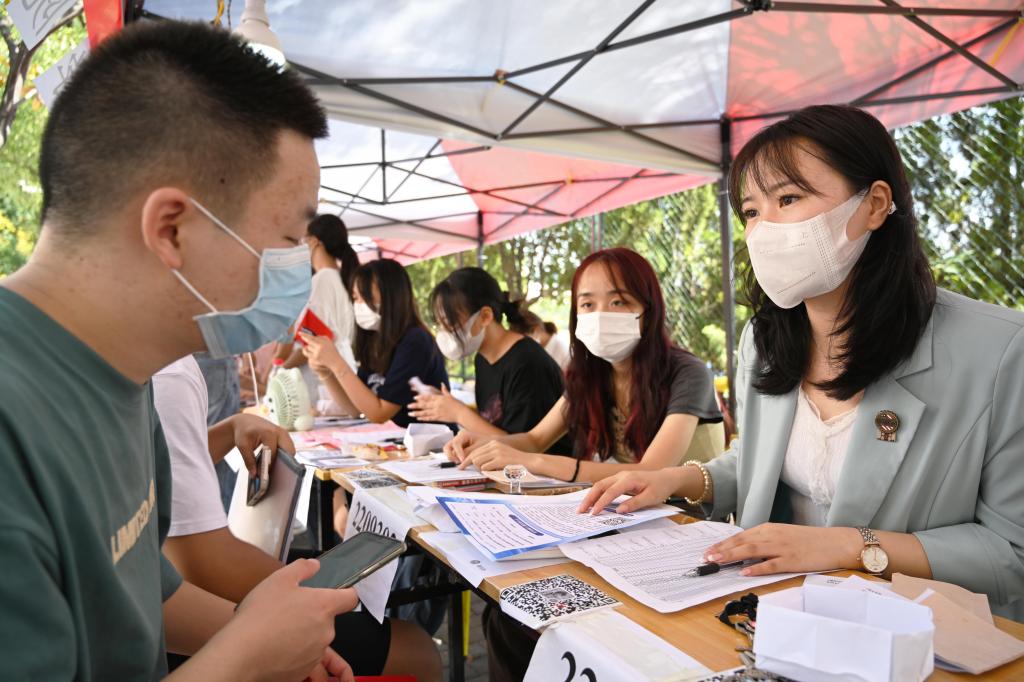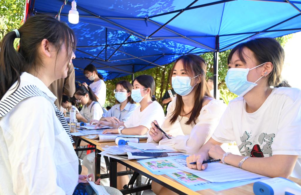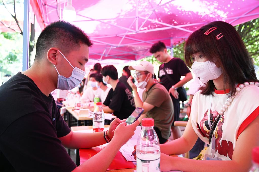 迎新点忙碌中的学生辅导员。