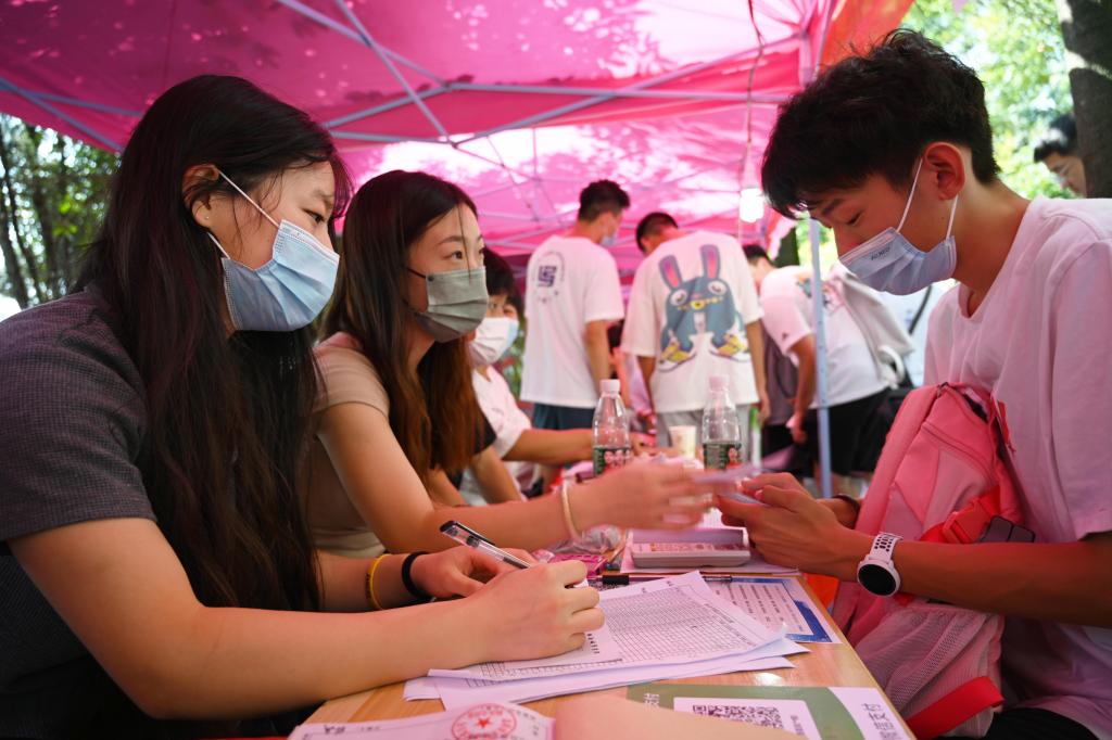 迎新点忙碌中的学生工作人员。