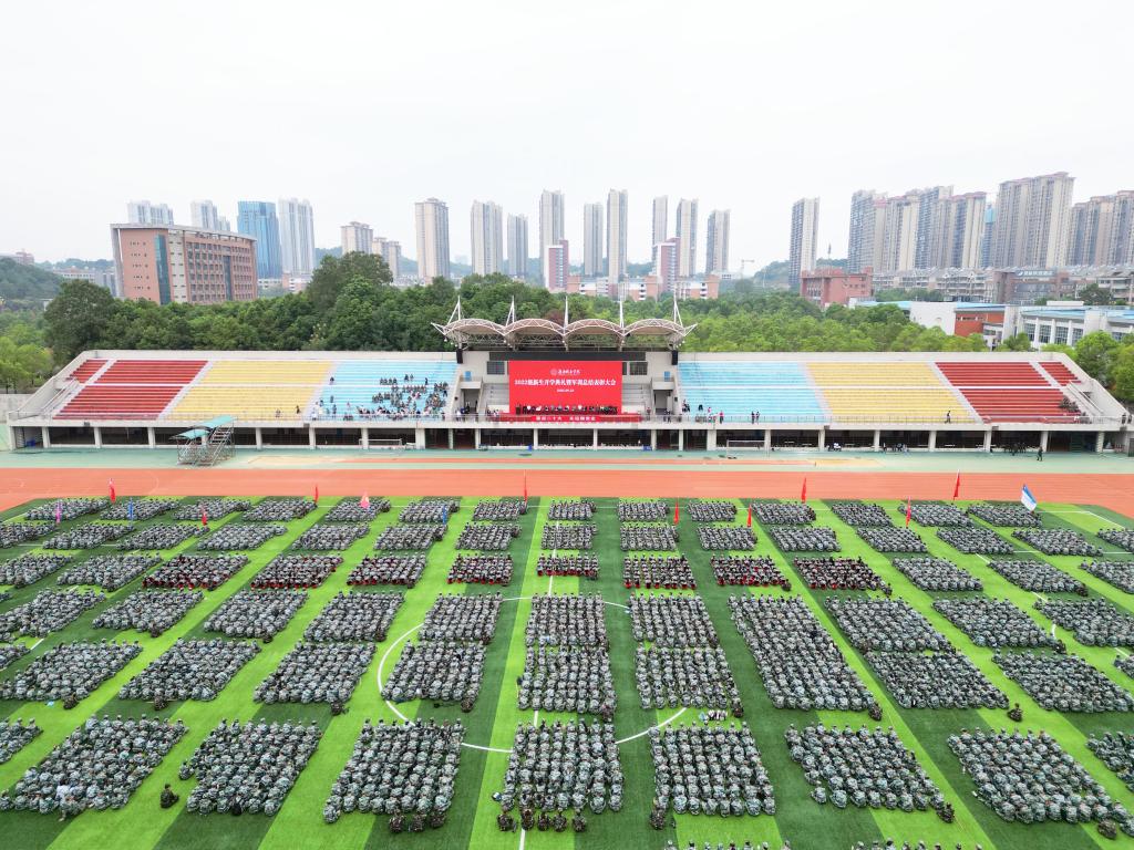 本网讯(文/图文彦波 张蓥 彭钦来 视频/张飞雪 李新会)四季长天同谱瑞,三秋桂子又飘香。9月23日上午,jdb电子游戏官方网站东田径场内红旗飘扬,口号嘹亮,欢声雷动,2022级本科新生开学典礼暨军训总结表彰大会正隆重举行。党委书记李建奇、校长汤放华等全体校领导出席,机关各部门主要负责人,各二级学院院长、书记、分管学生工作的副书记,2022级新生辅导员、班主任、教师代表以及2022级5913名本科新生参加。大会由李建奇主持。