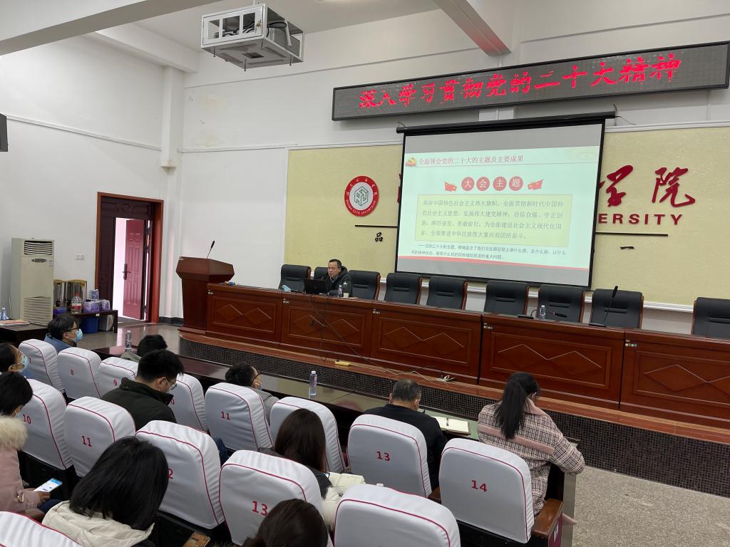 吕贤军紧扣党的二十大报告原文,围绕党的二十大的主题及主要成果、深刻认识新时代十年的伟大变革及其里程碑意义、不断开辟马克思主义中国化时代化新境界、牢牢把握新时代新征程中国共产党的使命任务、认真落实党的二十大提出的任务要求、用新的伟大奋斗创造新的伟业等方面,结合自身学习思考和学校发展实际,对党的二十大精神进行了深入浅出地阐述和全面系统地解读。同时,吕贤军就党员和教职工如何在日常工作中深入贯彻党的二十大精神、如何全面落实立德树人根本任务等问题进行了解答。