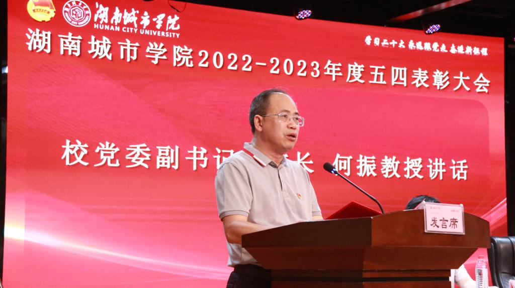 校长何振发表讲话。他指出,今天对学校共青团先进集体和个人进行表彰,是为了发挥青年典型模范带头作用,激励全校团员青年听党号召、跟党奋斗,不畏艰险、勇毅前行。广大青年生逢其时,要勇敢肩负起时代赋予的重任。他对广大青年提出四点希望:一要把牢“有理想”的政治标准。要坚定不移听党话、跟党走,与祖国共奋进,与时代共发展,与人民共命运,努力成长为堪当民族复兴重任的时代新人。二要突出“敢担当”的时代要求。在以中国式现代化全面推进中华民族伟大复兴的前进道路上,青年一代要迎难而上、挺膺担当,在党和人民最需要的时刻冲得出来、顶得上去。三要锤炼“能吃苦”的坚毅品格。要有“自讨苦吃”的精神,志存高远、脚踏实地,把课堂学习与社会实践紧密结合起来,在火热的实践中放飞青春理想,在拼搏的青春中成就事业华章。四要弘扬“肯奋斗”的光荣传统。当以奋斗为底色,在生命中最美好的年华里敢于追梦,在青春的赛道上奋力奔跑,勇于做走在时代前列的奋进者、开拓者、奉献者。