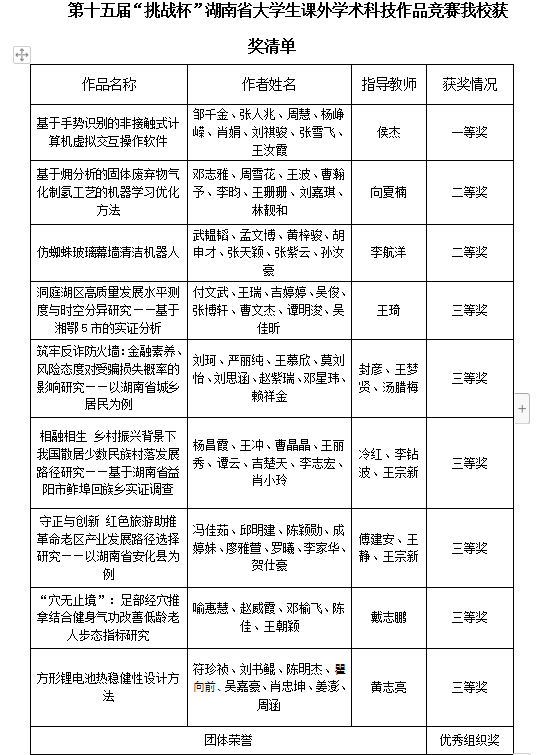 本网讯(通讯员 张根宝 彭鸿运)5月20日至22日,第十五届“挑战杯”湖南省大学生课外学术科技作品竞赛在长沙理工大学举行。经过激烈角逐,jdb电子共荣获一等奖1项,二等奖2项,三等奖6项,并被授予“优秀组织奖”。