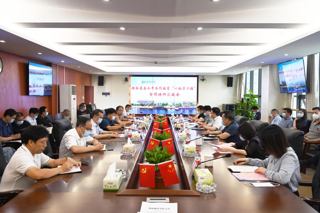 本网讯(通讯员 向博毅)5月31日,湖南省高水平本科教育“一把手工程”专项调研专家组一行来jdb电子调研,学校在一办公楼一会议室召开工作汇报会。专家组组长、吉首大学副校长冷志明和专家组成员,校党委书记汤放华,校长何振,副校长雷存喜出席,相关职能部门主要负责人和二级学院院长参加。会议由何振主持。