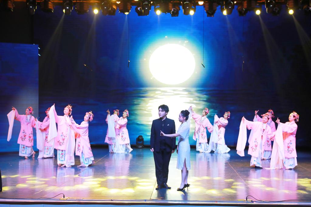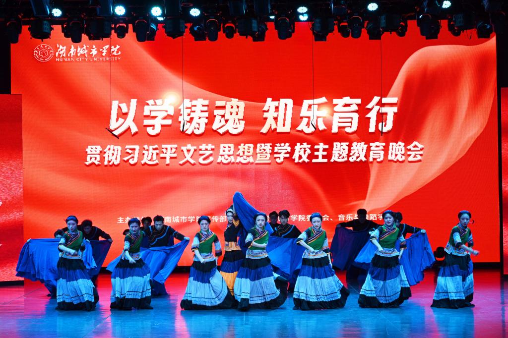 活动伊始,全场肃立,共唱国歌。随后,一曲震撼人心的器乐合奏《龙腾虎跃》拉开演出序幕,现场观众在鼓乐合奏中感受到了神州大地欣欣向荣、龙腾虎跃的繁荣景象。接下来的彝族舞蹈《守护》以舞蹈艺术方式向红色经典致敬,展现了彝族人民与红军诚挚的革命情谊。舞剧《天路》、歌曲《向往》《如愿》《春天的芭蕾》《领航》一一亮相,充分表达了青年学子对祖国的无限热爱,在艺术中学思想、强党性。舞蹈《云梦情》、歌曲《八百里洞庭美如画》描绘了江南的风光秀丽,展示人与自然和谐共生的美好生活。京剧折子戏《武家坡》展现了中国戏曲艺术的独特魅力;朗诵《奋斗青春,城院有我》体现了城院学子青春奋斗的决心,鼓励当代青年积极融入新时代奋进的浪潮,勇毅前行。演出在歌舞《美丽中国》中徐徐落下帷幕。