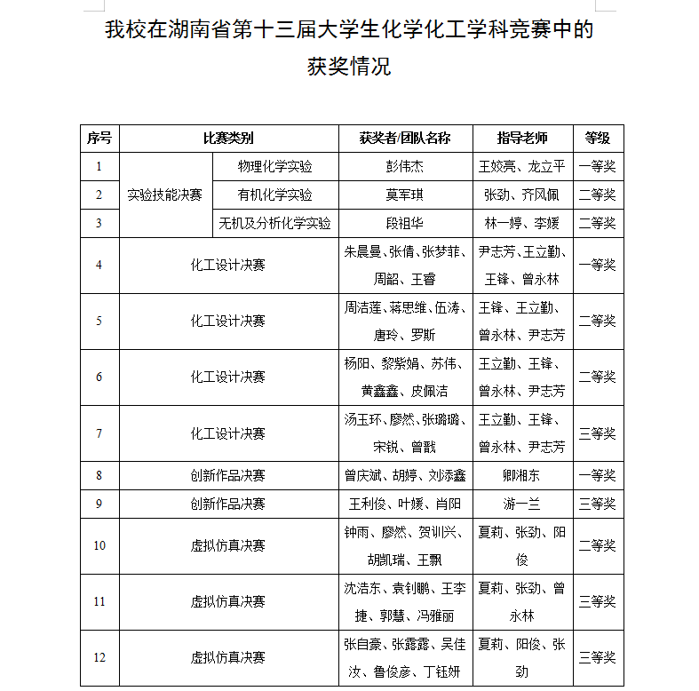 湖南省大学生化学化工学科竞赛设化学实验技能竞赛、化工设计竞赛、创新作品竞赛和虚拟仿真竞赛4个类别,旨在引导和推动我省高校化学化工类专业人才培养模式、实践教学和信息化教学改革,全面提高相关专业大学生实验技能、创新思维、工程设计和虚拟仿真设计能力,为优秀创新创业人才脱颖而出创造条件。