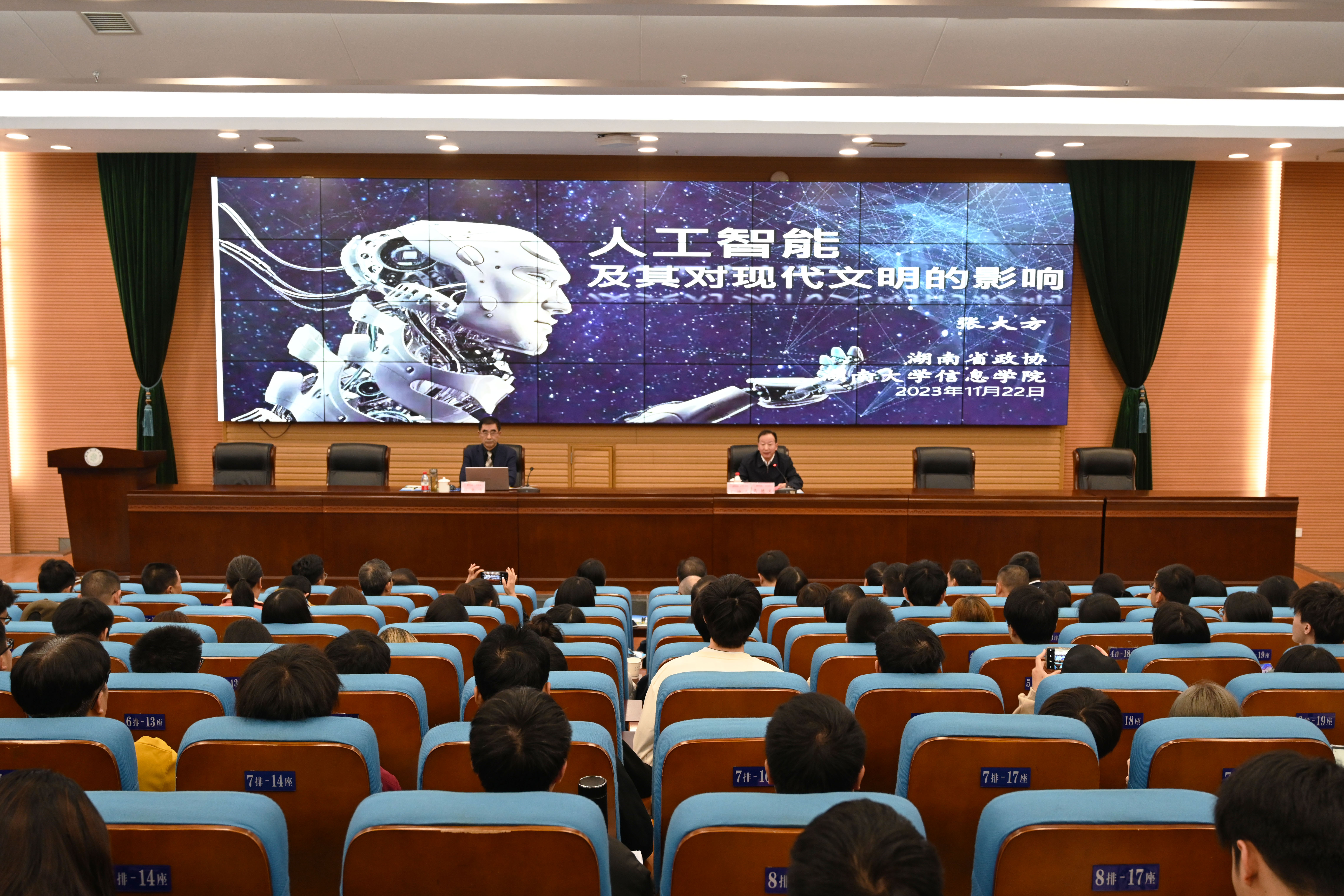 本网讯 11月22日,省政协原副主席、九三学社省委原主委、湖南大学张大方教授应邀来校,作了题为《人工智能技术及对现代文明的影响》的学术讲座。校长何振,益阳市委副书记、统战部部长邓斌出席。益阳市政协副主席、九三学社益阳市委主委、市科技局局长高德文主持。