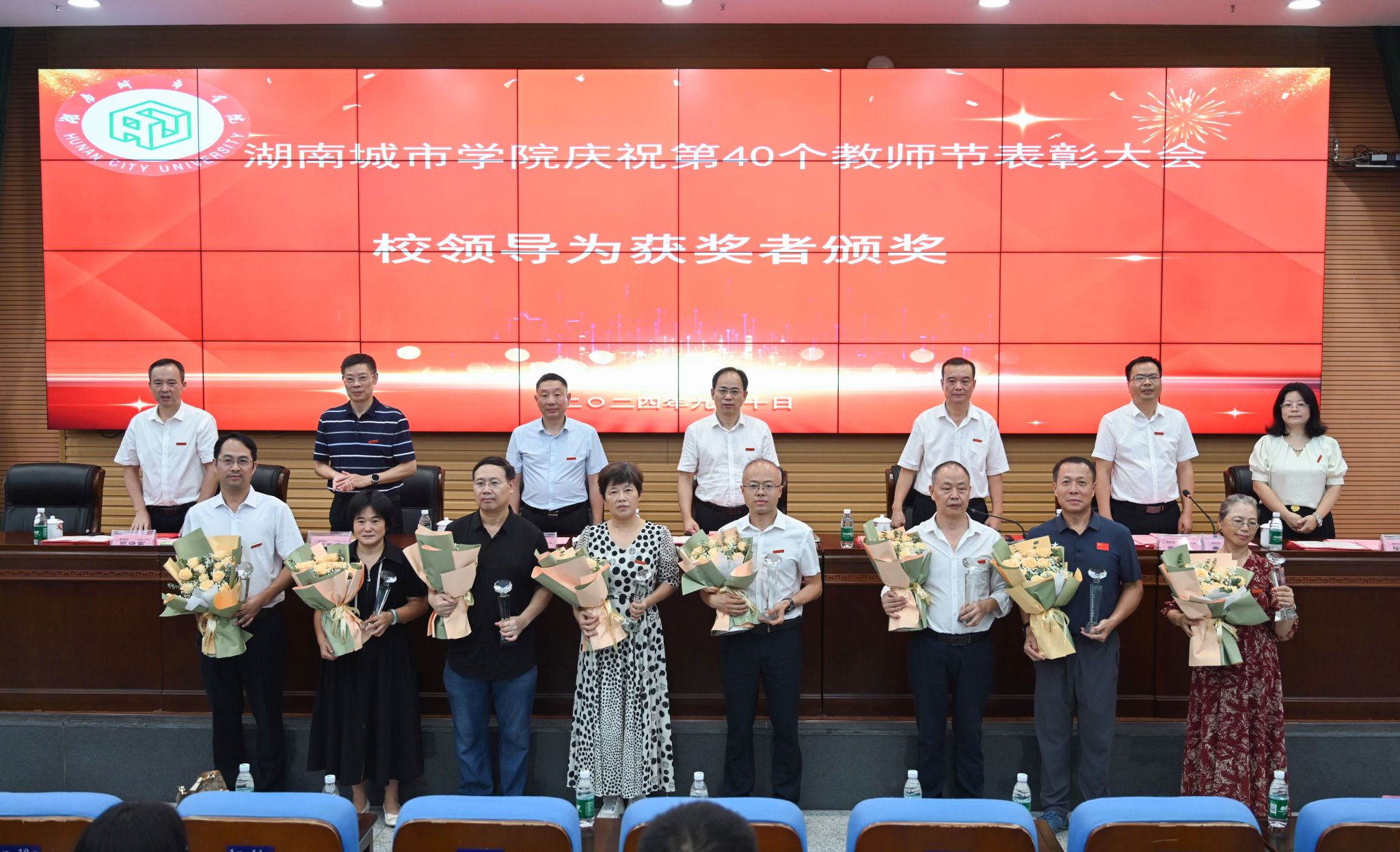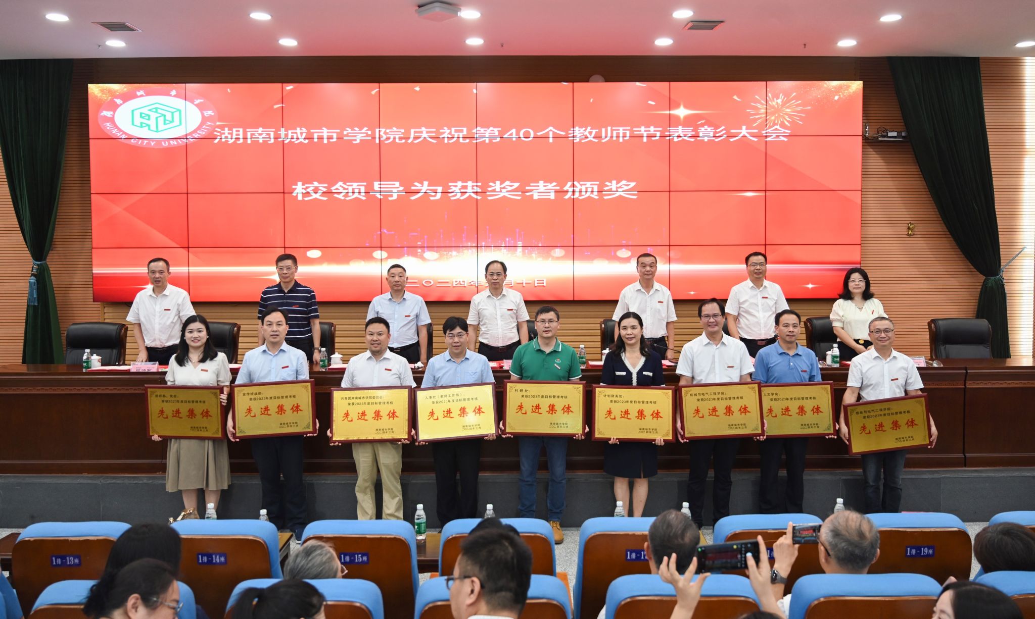 副校长雷存喜宣读了2023-2024学年获得的奖励成果业绩,2023年度单位目标管理考核先进集体及单项奖,2024年“师德先进个人”名单和第40个教师节先进人物(团队)名单。