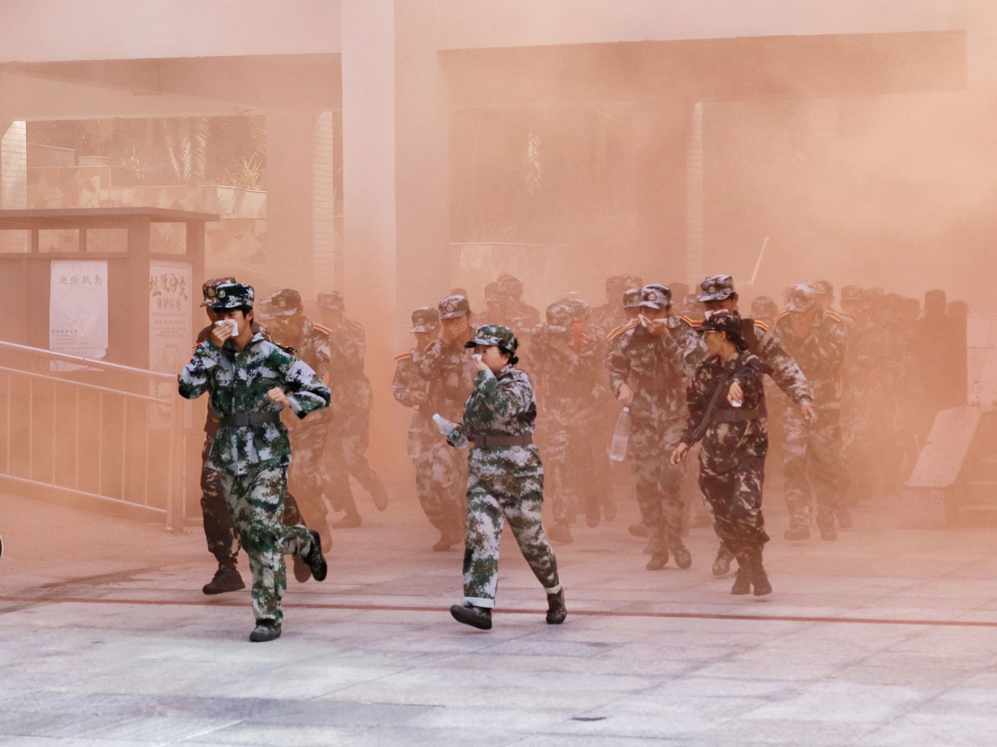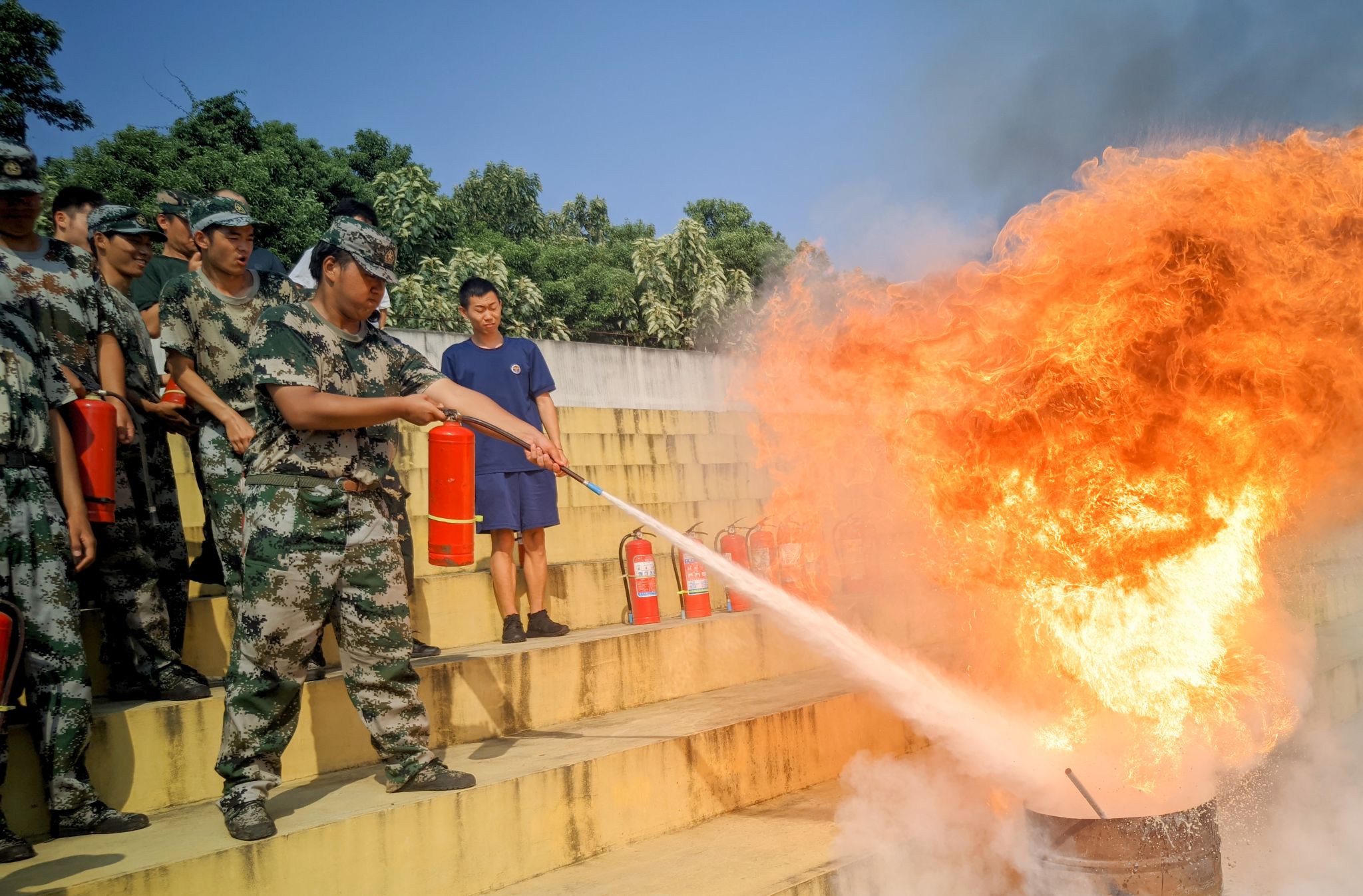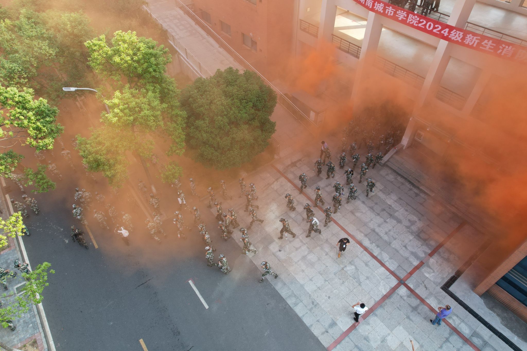 “请注意,现在有紧急情况,请大家保持镇静,有序沿紧急通道安全撤离!”随着一阵阵急促的警报声响起,本次消防安全演练正式开始。“同学们,别乱跑,走安全通道!”新生们按照教官和保卫工作部工作人员的指示用湿毛巾捂住口鼻,有序从教学楼的火灾烟雾中撤离出来,并迅速跑至田径场集合。“这里有火,快打开灭火器!”在学校的安排下,持有灭火器等消防器械的同学已准备就绪,在短时间内快速扑灭了危险火源,进一步确保了新生们的安全。