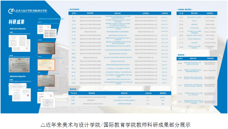 学院目前有教职工76人,专职教师73人,外籍教师12人(视觉传达设计系中外合作办学项目),外聘教师22人。专职教师中拥有教授、副教授20人,博士22人(含在读博士),硕士生导师13人,中国美术家协会会员3人,湖南省新世纪“121”人才1人,湖南省普通高校美术与设计类教指委委员1人,湖南省美术家协会艺委会委员2人,湖南省青年骨干教师4人,湖南省最美基层团干1人。教师的职称、学历、年龄结构相对合理,人才队伍实现了质的飞跃,师资队伍结构得到进一步优化。学院修订完善人才培养方案,加强教学内涵建设,着力提高教学质量,加强教学质量监督与服务保障。学院立项省级一流本科课程1门,立项校级思政课程3门。近年来,学院教师承担国家社科基金、国家社科基金艺术学项目、国家自科基金项目、教育部人文社科项目、国家民宗委项目、省社科基金项目、省社科联项目、省教改等教学科研项目130余项,其中国家级项目6项。获湖南省社科成果三等奖1项,湖南省教学成果二等奖1项,优秀教学案例获国家级一等奖1项,教师作品参加各级各类展览上百次,其中获国家级奖项10余项、省厅级奖项40余项。出版专著、教材20余部,在各级期刊发表论文及作品300余篇,其中在CSSCI等核心期刊发表论文及作品100余篇,获国家发明专利10项、实用新型专利100余项。
