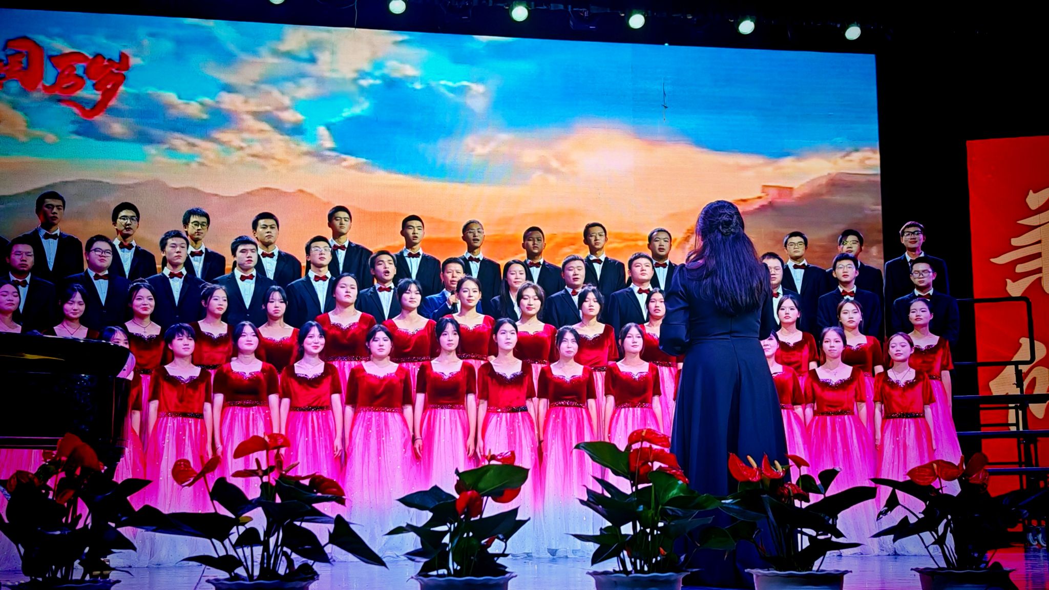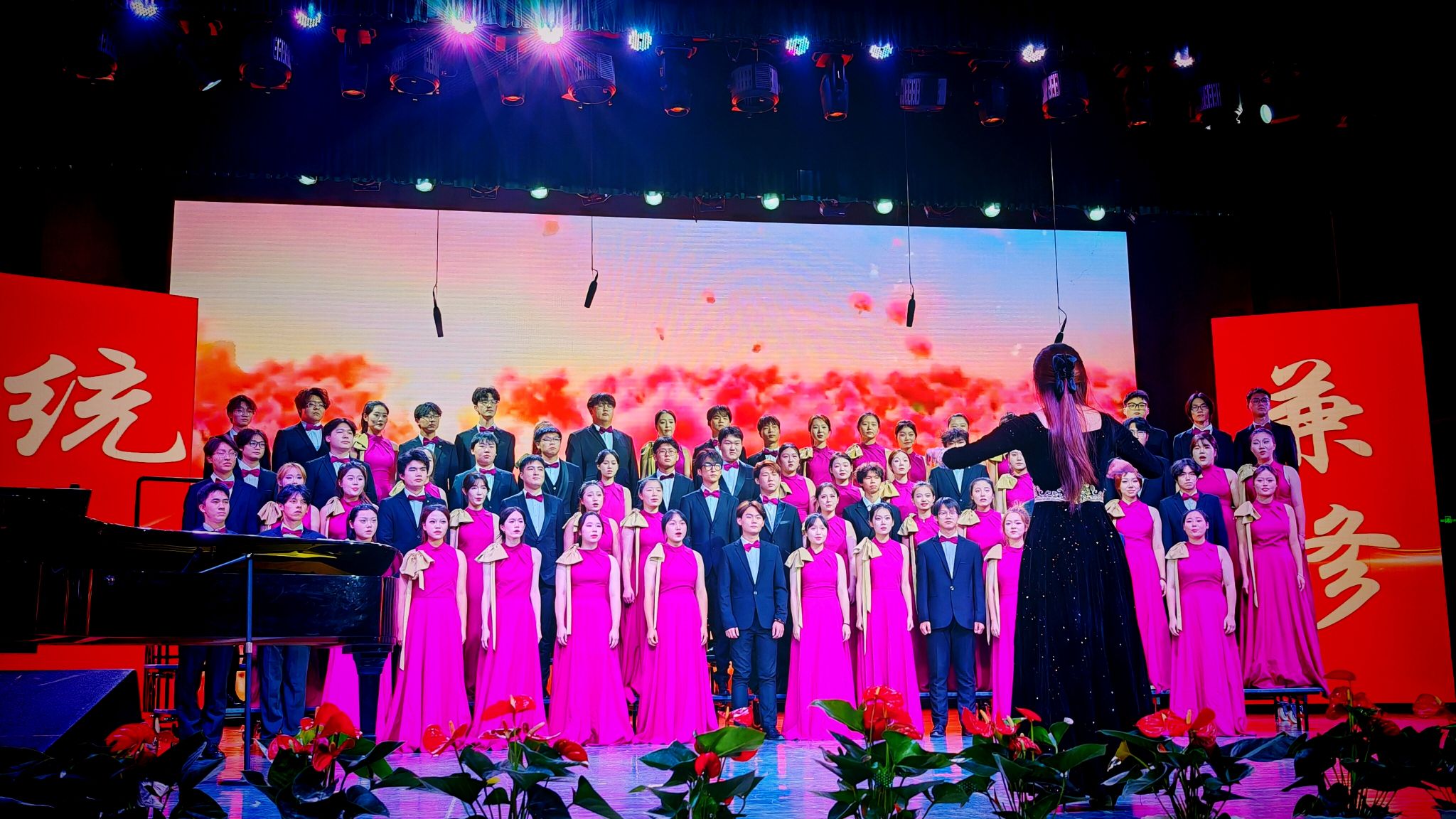 从校歌到经典红歌,再到励志歌曲,每一首歌曲都承载着不同的情感与故事。市政与测绘工程合唱团队以一首深情的《天耀中华》打动了现场观众的心,他们用悠扬的歌声表达了对祖国的深情厚谊,展现了当代大学生的家国情怀。而土木工程学院合唱团队则选择了一首《如愿》,以悠扬的旋律和深情的歌词,诉说着青春的故事,激励着在场的每一位青年学子珍惜时光,勇敢追梦。《不忘初心》《灯火里的中国》《祖国不会忘记》《国家》《有我》《精忠报国》……一首首耳熟能详的歌曲回荡在大厅内,师生们用嘹亮的歌声唱响了新时代青年的爱党爱国爱校之情。