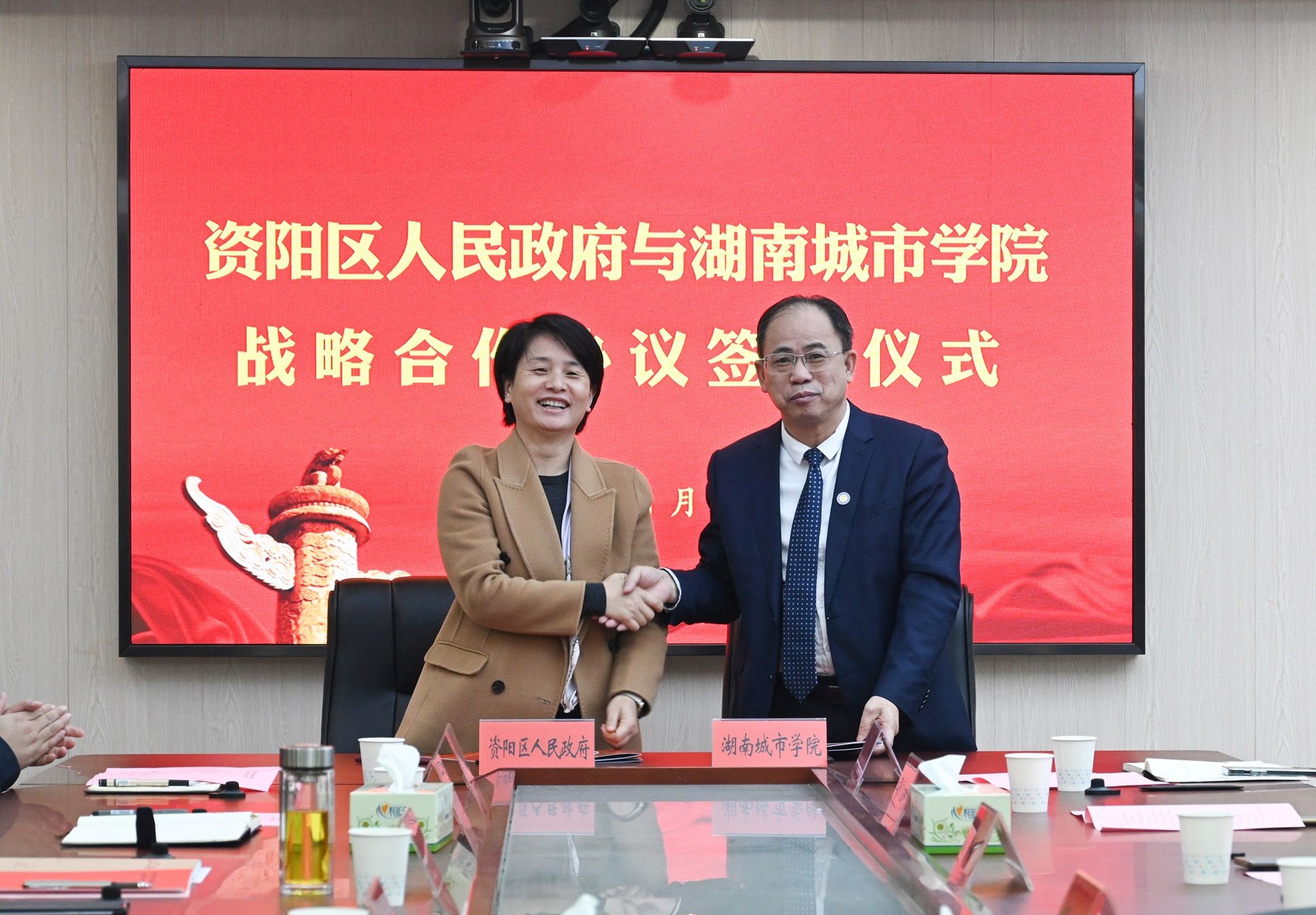 本网讯 1月3日,jdb电子与资阳区人民政府战略合作协议签约仪式举行。全体校领导出席签约仪式,资阳区区长黄瑛致欢迎辞,资阳区区委副书记、区委统战部部长张辉主持会议。