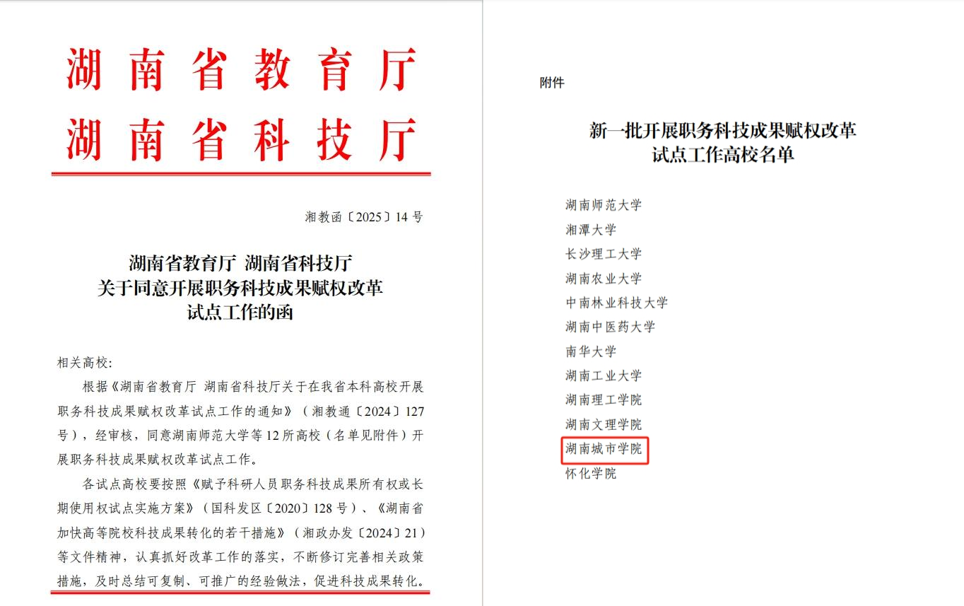 本网讯(通讯员 刘湛军)近日,湖南省教育厅、科学技术厅联合发布《关于同意开展职务科技成果赋权改革试点工作的函》,jdb电子获批为开展职务科技成果赋权改革试点单位。