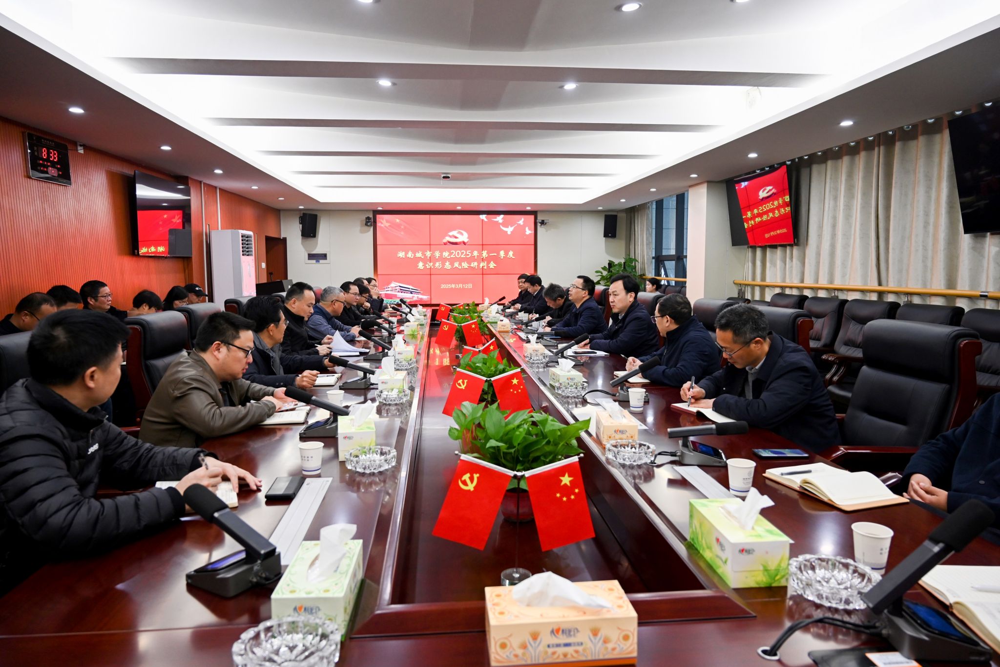本网讯(通讯员 蔡润晨)3月12日,学校在一办公楼一会议室召开2025年第一季度意识形态风险研判会,专题研究学校意识形态工作和校园安全稳定工作。党委副书记袁志成主持会议。